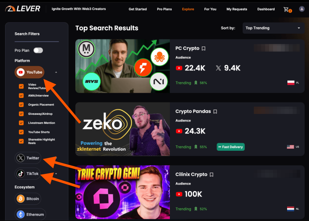 At the time of writing, Lever's creator database contains over 500 fully vetted Web3 KOLs, tapping into a combined audience of over 20 million potential viewers across platforms like X, YouTube, and TikTok.