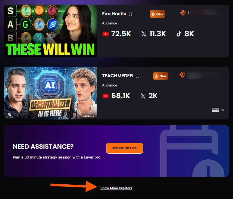 The marketplace automatically displays the Top 6 creators within your search parameters. You can load additional KOL profiles by clicking "Show More Creators" at the bottom of the page.