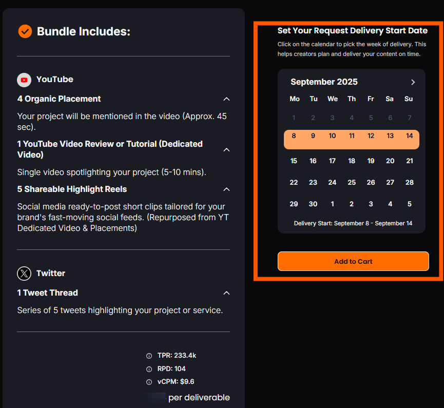 Choose when you'd like to start receiving your first deliverables. Get started right away, or reserve a creator's time and lock in today's bundle prices for your upcoming campaigns.