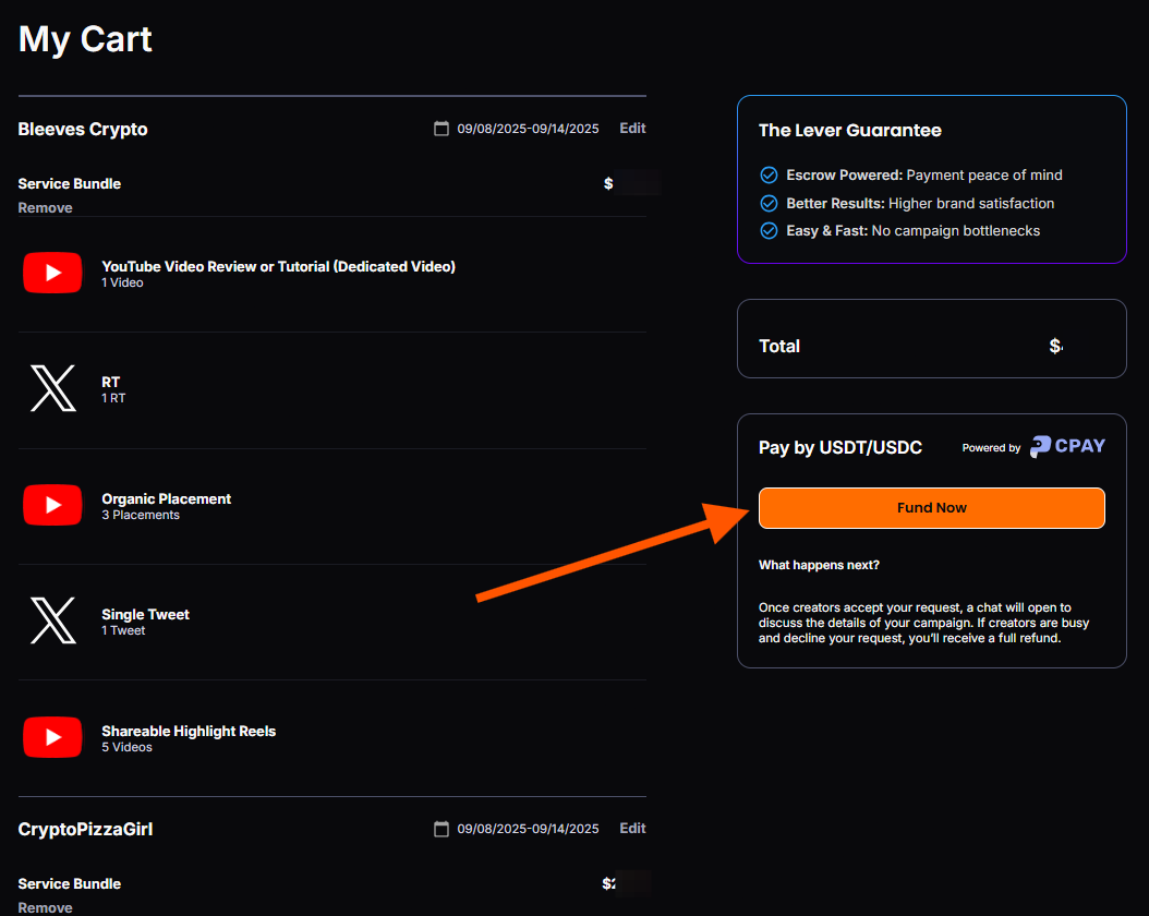 After you've added creator bundles to your shopping cart, you can fund your requests by clicking "Fund Now" in the "My Cart" page. You'll be directed to CPAY, where you can complete your purchase using stablecoins.