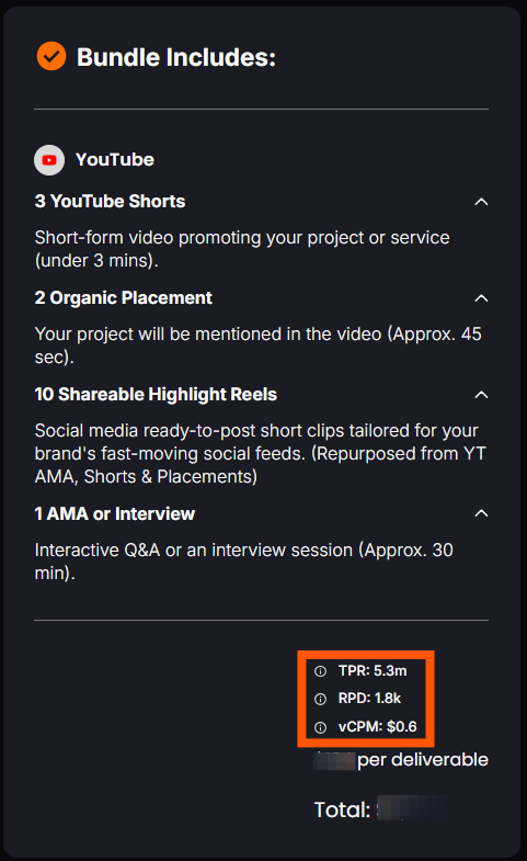 Each bundle comes with built-in performance stats. These numbers give you a quick way to measure potential reach, efficiency, and cost-effectiveness before launching your campaign.