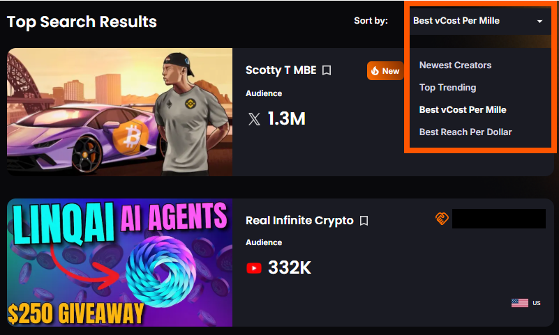 Sort creators using the dropdown menu by price, reach, recency, or trending status to streamline your search and identify the perfect KOL for your campaign. You can sort by the following parameters: